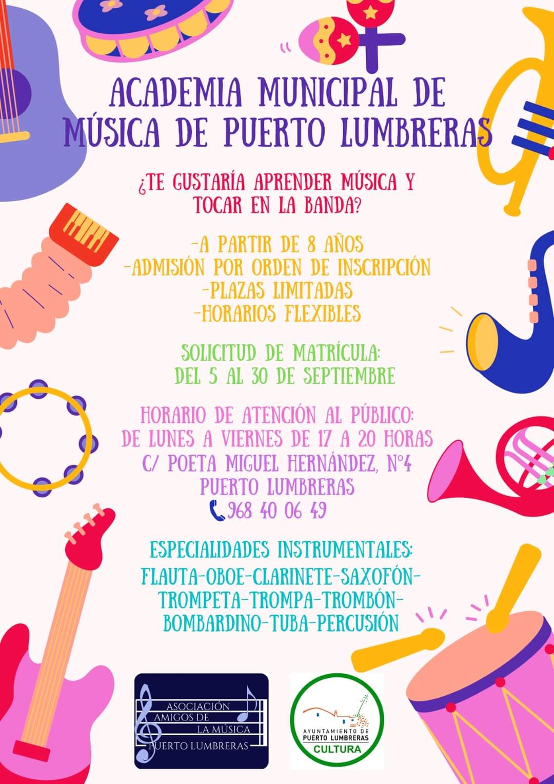 El concejal de Cultura ha destacado que “un año más se abre este periodo de matriculación para continuar con los estudios musicales o para iniciarlos. Además, los discentes de la academia podrán participar en la Banda Municipal de Música de Puerto Lumbreras, y colaborar en todos los actos y conciertos que el grupo lleva a cabo en la localidad. El objetivo es que la Banda de la continúe su crecimiento, de igual forma que la cultura musical de Puerto Lumbreras”.