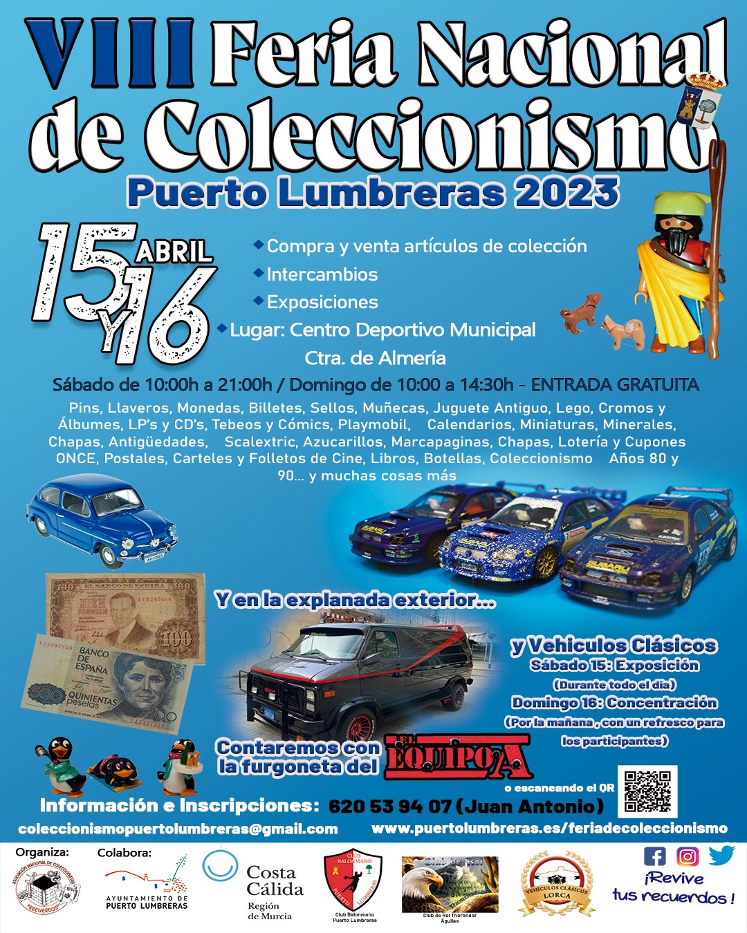 «Puerto Lumbreras se convertirá, otro año más, en sede y epicentro del coleccionismo. Esta feria, en la que podemos encontrar artículos de diversa índole que nos pueden llevar a nuestra infancia o simplemente hacernos ver las maneras de vivir en el pasado, ya es prácticamente una tradición. Desde el Ayuntamiento colaboraremos de forma estrecha con los organizadores para que se lleve a cabo con todas las garantías. Al mismo tiempo, agradecerles el interés en continuar con en este evento y seguir pensando en el municipio para llevarlo a cabo. Pues supone dar a Puerto Lumbreras, una actividad diferente e interesante que anime a lumbrerenses y visitantes a disfrutar de una jornada en el municipio», ha indicado Túnez.