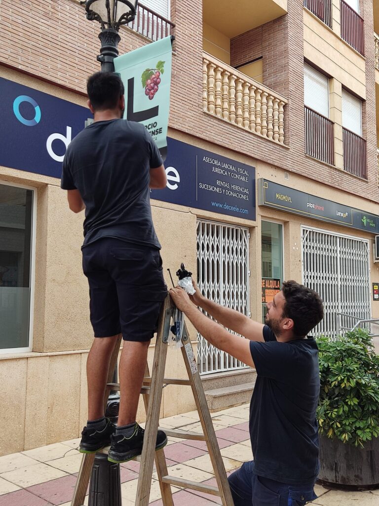 31 de agosto de 2023. La alcaldesa de Puerto Lumbreras, María Ángeles Túnez; la concejala de Dinamización Económica, Jerónima María Reinaldos; y el presidente de ASEPLU, Juan Gallardo; han presenciado el momento de colgar los carteles que llevan el logotipo y eslogan ganadores en las principales calles y avenidas de comercio de Puerto Lumbreras.
