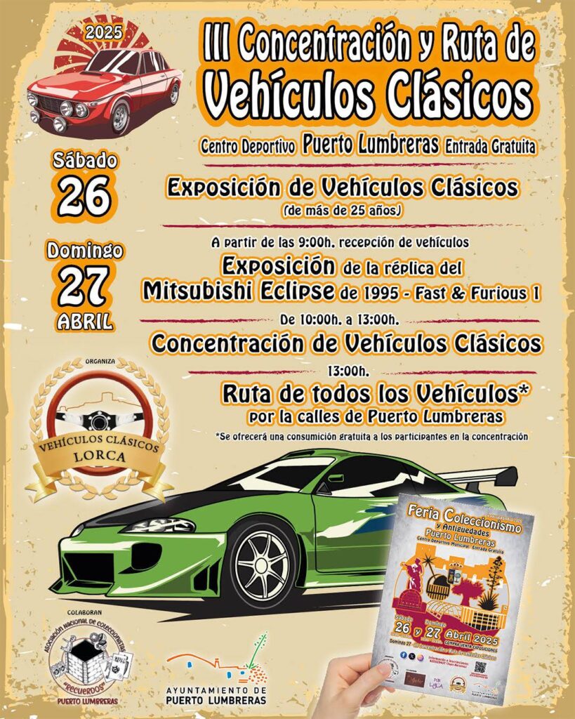 “Además, celebraremos también la tercera edición de la Concentración y Ruta de Vehículos Clásicos. El día 26 será la exposición de vehículos clásicos, con más de 25 años y, el domingo 27, se incorporará a la exposición la réplica del coche de Fast&Furious 1, el Mitsubishi Eclipse de 1995. De 10:00 a 13:00 horas, será la Concentración de Vehículos Clásicos y, a las 13:00 horas, la ruta de todos los vehículos por las calles del municipio. Todo ello, gracias a la colaboración de la Asociación Vehículos Clásicos Lorca”.