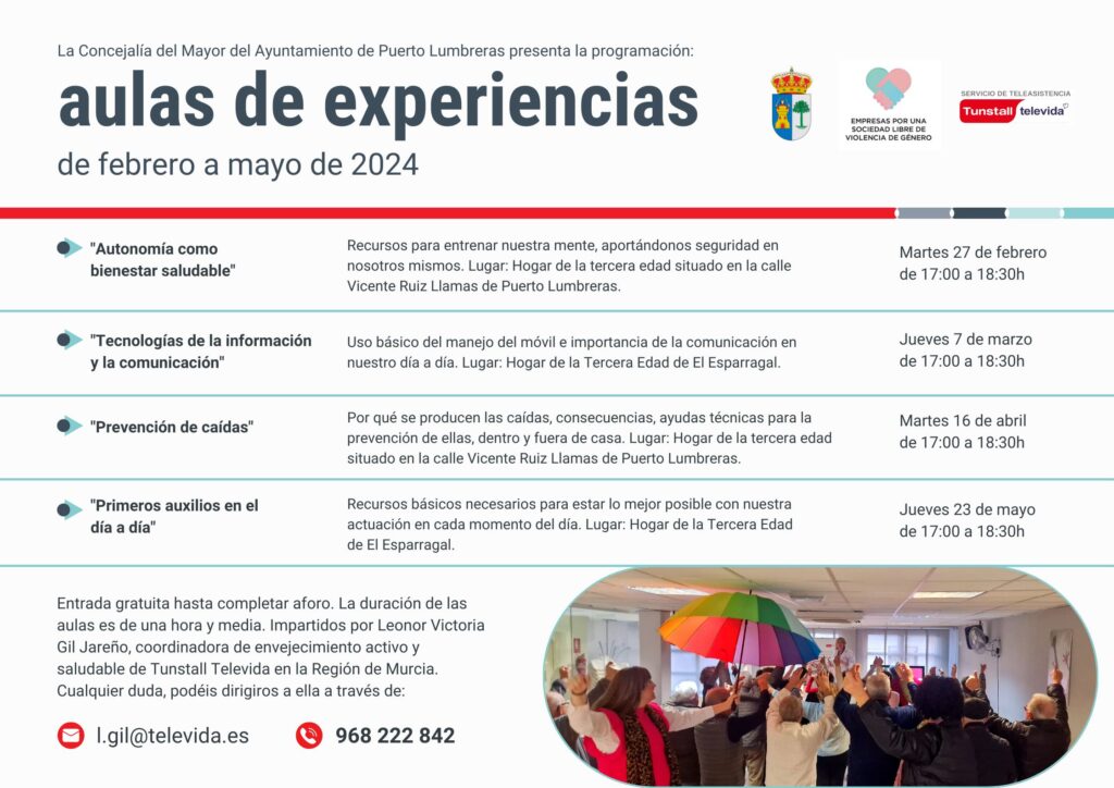 Y ha añadido que “son eventos saludables impartidos por Leonor Victoria Gil Jareño, coordinadora del envejecimiento activo y saludable de Tunstall Televida Región de Murcia. La compañía, líder del sector de la teleasistencia y la salud digital en España, cuenta con una plantilla formada por más de 1.4000 profesionales que ofrecen un servicio de atención personalidad y accesible”.