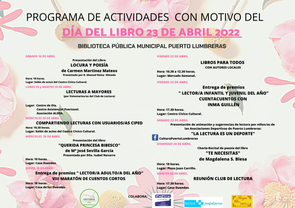 “Animamos a todos los lumbrerenses a disfrutar de estas actividades durante los próximos días. La programación se ha elaborado con el fin de animar a la lectura, remarcar la importancia que tienen los libros en el desarrollo y en nuestra vida diaria, así como su poder para meternos de llenos en las historias que nos cuentan sus letras; y fomentar este hábito así como el uso y el conocimiento de los diferentes servicios que ofrece nuestra Biblioteca Municipal. Además, volvemos a invitar a hacerse socio del centro, que continúa con su importante labor de fomento de la lectura entre usuarios y ciudadanos de Puerto Lumbreras”, ha concluido Navarro.