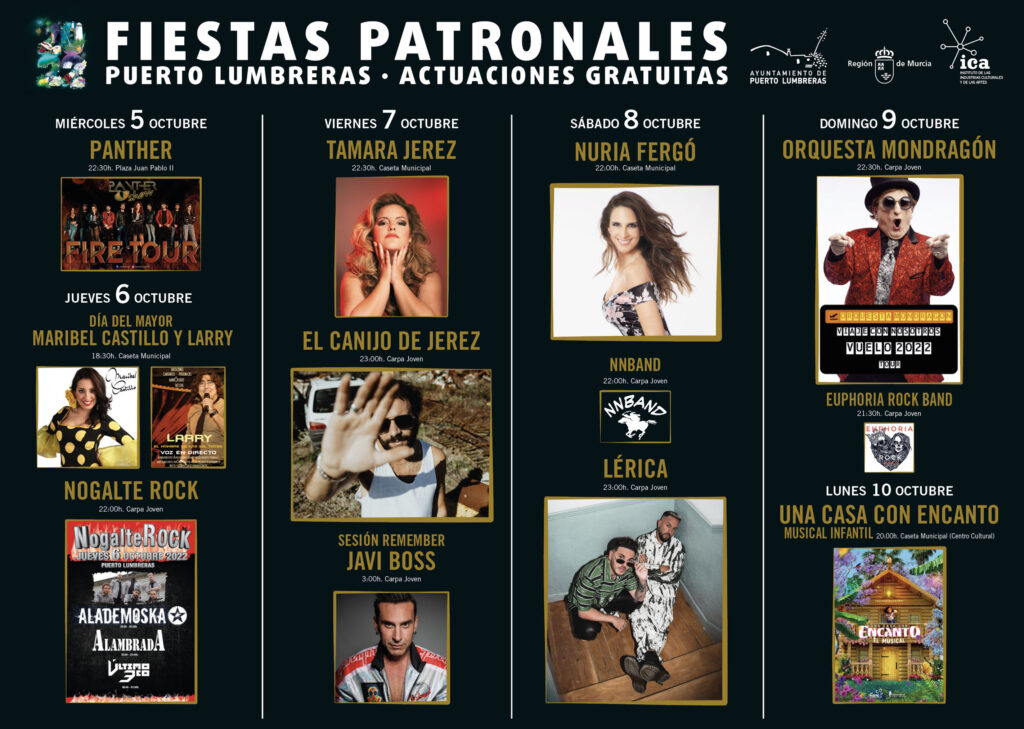 Puerto Lumbreras volverá a vivir sus fiestas con unas cincuenta actividades que se llevarán a cabo desde el domingo 2 de octubre hasta el miércoles 12 de octubre. La alcaldesa ha remarcado que «recuperamos nuestra feria con total normalidad, tras la pasada edición marcada por las medidas sanitarias por la pandemia”.